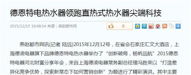 2015年12月12號(hào),在省會(huì)石家莊匯文大酒店,上海德凌電器旗下品牌德恩特電熱水器舉辦了“創(chuàng)新破局,楊帆遠(yuǎn)航”2015德恩特電器河北財(cái)富分享年會(huì)